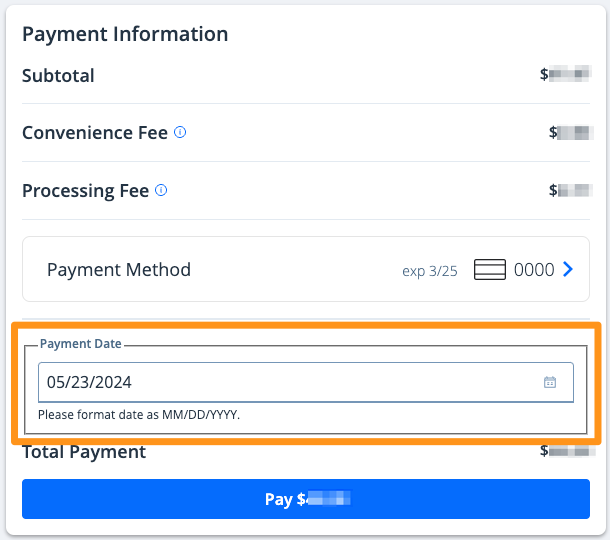 2. After choosing your payment method, select your preferred "Payment Date", then click the blue Pay $--.-- button to complete your payment