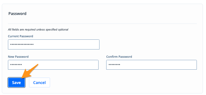 4. Enter the Current Password, New Password, and re-enter the new password in the Confirm Password field. Then click Save.